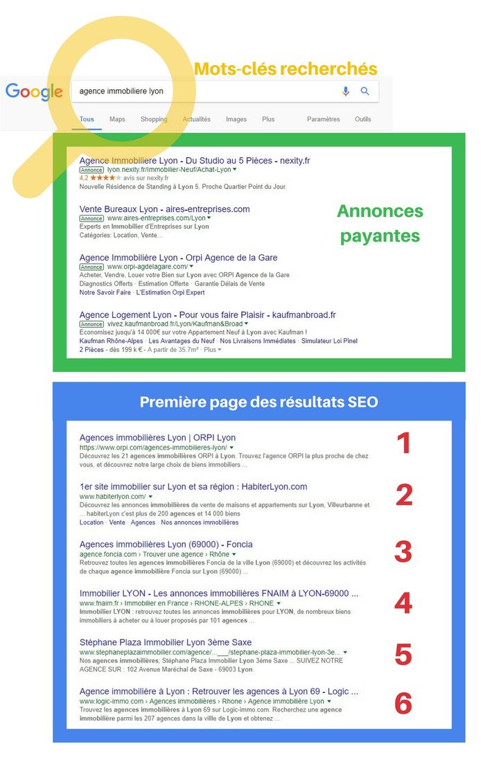 Lorsque vous faites une recherche de mot-clé sur Google (“ agence immobilière lyon ” par exemple), voici comment apparaissent les résultats : Pour les annonces qui figurent dans l’encadré vert, les annonceurs paient Google à chaque fois qu’un internaute clique. Vous êtes visible tant que vous payez pour que vos annonces figurent en tête des résultats de recherche, ce qui nécessite d’être prêt à y allouer un certain budget. On appelle cette stratégie le SEA (Search Engine Advertising). Les résultats qui apparaissent dans l’encadré bleu sont quant à eux les résultats de recherche dits “organiques”. Ils sont le fruit d’un travail sur le long terme. Avec le SEO, construire un positionnement peut prendre des semaines, des mois, voire des années. Cela dépend du degré de compétitivité du mot-clé et de la pertinence des actions mises en place.Deux approches complémentaires