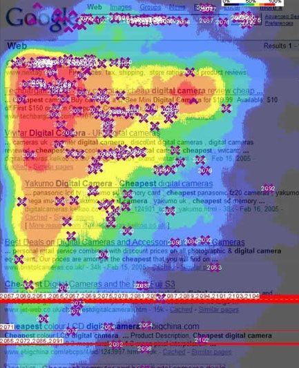 En référencement naturel, seule une position sur la première page des résultats d’une recherche de mot-clé donne réellement des chances d’attirer un internaute. Posez-vous d’ailleurs la question suivante : en tant qu’internaute, jusqu’à quelle page allez-vous chercher la réponse lorsque vous tapez un mot-clé sur Google ? Dans la quasi-totalité des cas, l’internaute s’arrête à la première page, éventuellement la deuxième. Et même en première page, les écarts sont significatifs d’une position à la suivante. L’outil Advanced Web Ranking observe que les 5 premiers résultats représentent 70 à 80% des clics des internautes.* La heat map (carte de chaleur) ci-dessous montre bien que l’œil humain et le curseur de la souris concentrent leur attention tout en haut à gauche de l’écran.2/ Du contenu de qualité tu créeras