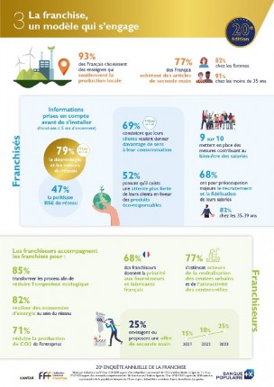 La 20ᵉ Enquête de la franchise Banque Populaire, réalisée en partenariat avec la Fédération Française de la Franchise et Kantar, offre un aperçu riche et nuancé des dynamiques du marché de la franchise en France. Le 3ᵉ chapitre de cette 20ᵉ Enquête de la franchise se penche sur l’adaptation des franchiseurs et franchisés aux nouvelles attentes de consommation. Les résultats de l’enquête mettent en évidence une attente des consommateurs toujours plus forte envers l'écoresponsabilité, le développement durable et la RSE. Comment les franchises s’adaptent à ces attentes et quel impact l’intégration de pratiques écoresponsables et de RSE a-t-elle sur leur performance économique ?