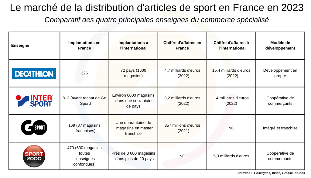 Après une année 2020 marquée par la crise sanitaire, le marché français de la distribution d'articles de sport a connu une forte reprise dès 2021. Dominé par quatre enseignes majeures - Decathlon, Go Sport, Sport 2000 et Intersport - ce secteur voit une concurrence accrue entre ces géants qui cherchent à se différencier par leur positionnement, leur offre de marques et leur modèle de développement. Avec la reprise de Go Sport par Intersport en avril 2023, le marché devrait subir d'importantes transformations. Cette opération majeure va permettre à Intersport de renforcer significativement son maillage territorial et de concurrencer plus directement Décathlon. Ce dernier reste leader du secteur avec 4,7 milliards d’euros de chiffre d’affaires réalisé en France en 2022 contre 3,2 milliards d’euros pour Intersport.