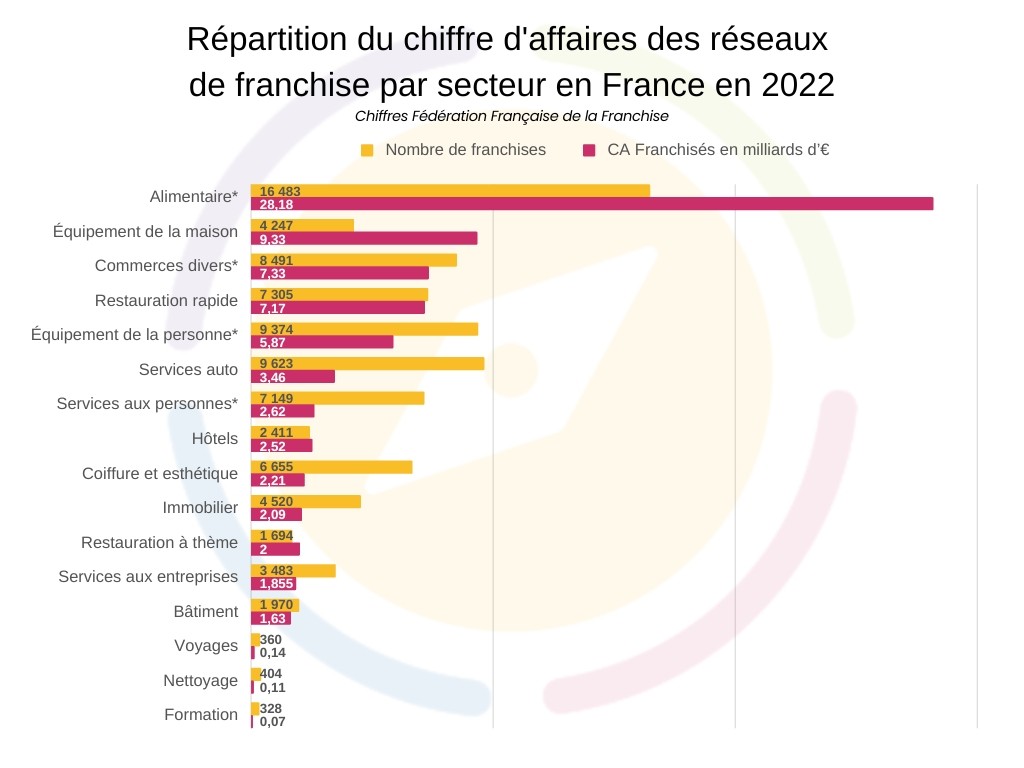 L’alimentaire génère ainsi plus du tiers du chiffre d’affaires (37,6%) réalisé par l’ensemble des entreprises franchisées au cours de l’année. Il est également le secteur le plus représenté en nombre de points de vente franchisés avec 16 483 points de vente.