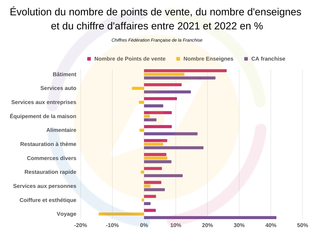 Du point de vue de la dynamique d’expansion, c’est sans conteste le secteur du bâtiment qui tire son épingle du jeu, porté par un marché particulièrement dynamique en 2022. Entre 2021 et 2022, le nombre de points de vente du secteur a augmenté de 26% quand le nombre d’enseigne augmentait de 12,7%. Le chiffre d’affaires du secteur suit une même dynamique haussière avec 22,5% de croissance, la seconde plus forte progression après le secteur du voyage. Ce dernier, à la faveur de la levée des restrictions de déplacement, réalise logiquement la plus forte progression de chiffres d’affaires entre 2021 et 2022.