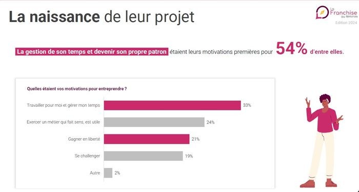 Les femmes sont de plus en plus nombreuses à se lancer dans une création d’entreprise et la franchise les attire particulièrement puisqu’elles représentent 36% des franchisés en activité selon les derniers chiffres de la Fédération française de la franchise. Toute la Franchise et Reconversion en franchise ont voulu en savoir plus sur leur parcours professionnel et leurs motivations à devenir indépendantes via la franchise. Les résultats du Baromètre de la franchise au féminin 2024 viennent d'être dévoilés à la presse et l'ensemble des chiffres seront détaillés la semaine prochaine lors d'un webinaire dédié.