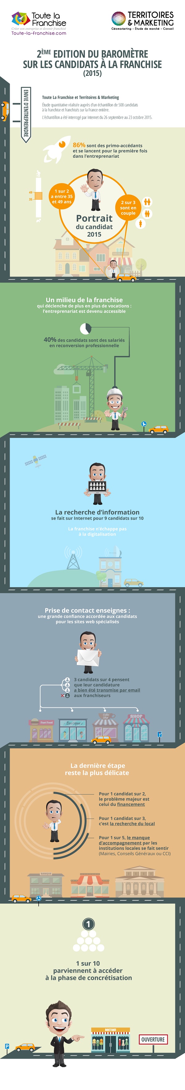Toute La Franchise et Territoires & Marketing dévoilent leur deuxième édition du baromètre des candidats à la franchise. L’étude est basée sur plus de 500 interviews de candidats. En plus de mettre en exergue les différentes étapes par lequelles il faut passer pour devenir franchisé, l’étude révèle aussi les difficultés rencontrées par les porteurs de projet dans le parcours qu’ils enpruntent pour entreprendre.