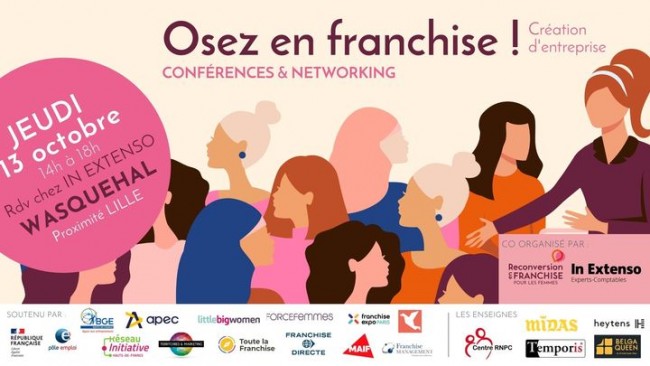 Pour répondre aux attentes des femmes et leur permettre d’OSER, la plate-forme www.reconversionenfranchise.com, dédiée à la reconversion des femmes et la franchise organise chaque année dans les territoires des rendez-vous de proximité avec les acteurs locaux. Ainsi la 3e édition de l’évènement « OSEZ EN FRANCHSIE, se déroulera en région Hauts-de-France en partenariat avec le cabinet d’expertise comptable IN EXTENSO le jeudi 13 octobre de 14h à 18h à l’agence In Extenso de Wasquehal.