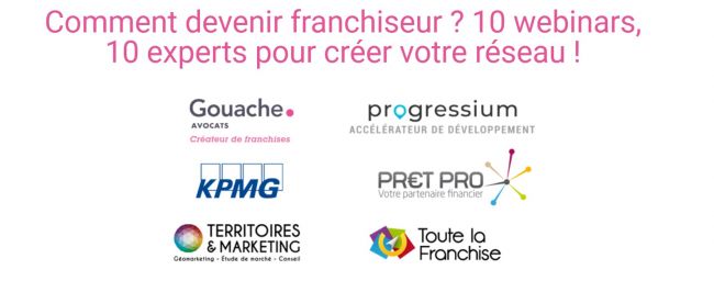 Au cours de ces conférences en ligne, des professionnels de KPMG, leader de l’audit, du conseil et de l’expertise comptable, de Prêt Pro, spécialiste du courtage en financement professionnel, de Progressium, cabinet spécialisé dans le conseil et le développemnt des réseaux de franchise, de Territoires et Marketing, spécialiste du géomarketing et des études de marché, et de Toute la Franchise, leader dans la mise en relation entre créateurs d’entreprise et franchiseurs, interviendront pour apporter leur éclairage sur l’ensemble de ces questions.