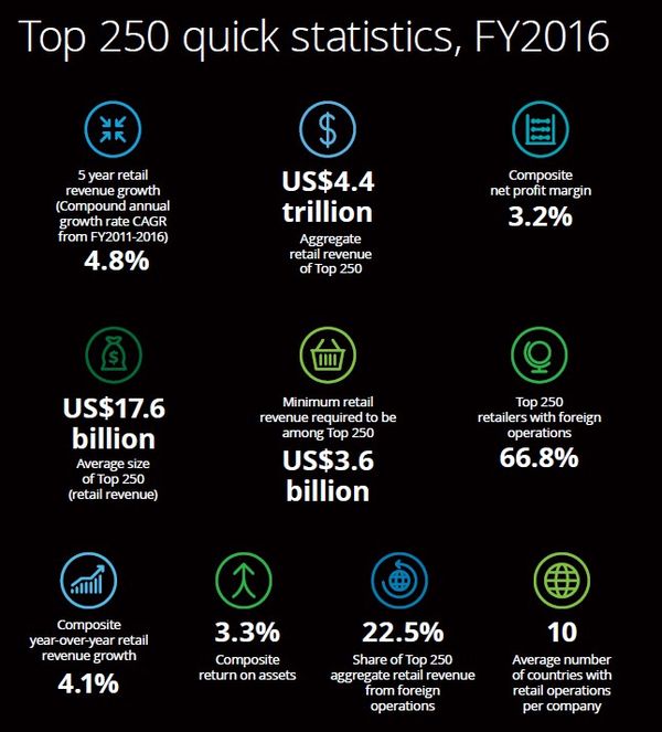 En janvier dernier, le cabinet Deloitte a publié son traditionnel “Global Powers of Retailing”, un palmarès annuel des 250 enseignes de distribution les plus performantes du monde (en fonction des données fiscales 2016). La France compte 12 représentants dans ce TOP 250 de la distribution mondiale.