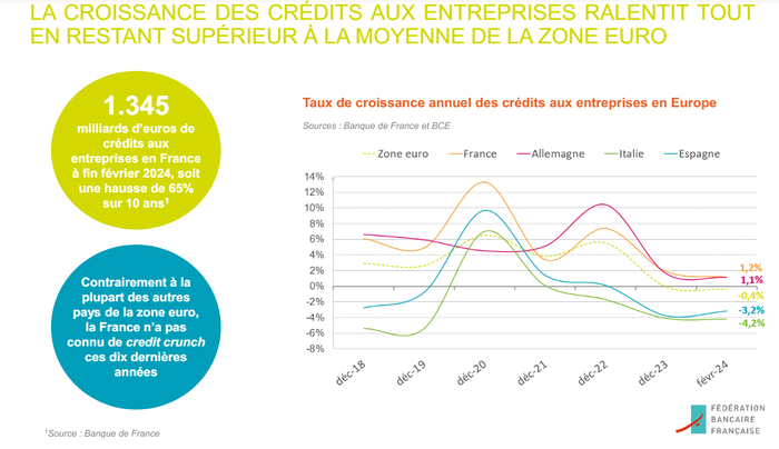 Une récente étude de la Fédération Bancaire Française (FBF), montre que les entreprises continuent à emprunter malgré la conjoncture économique actuelle et la politique monétaire restrictive. En effet, l'encours des crédits accordés aux entreprises a progressé de 1,2 % sur un an.