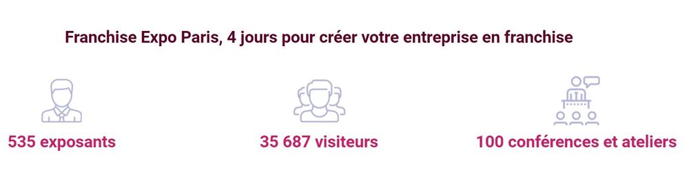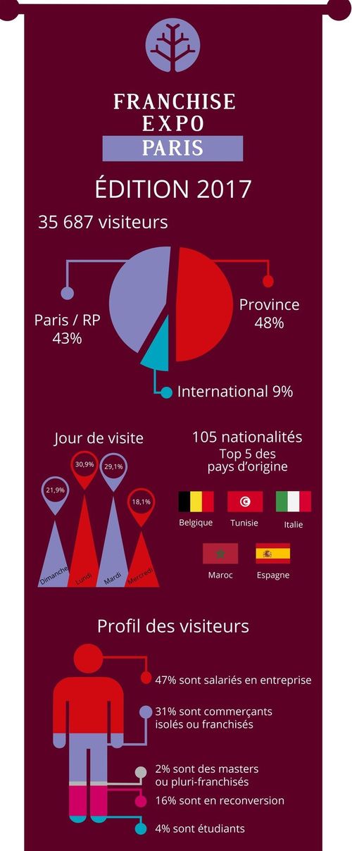 Franchise Expo Paris est un salon international entièrement dédié à la franchise. Les visiteurs (plus de 35.000 en 2017, - cf l’infographie de fréquentation de la 36e édition du salon de la franchise de Paris) sont essentiellement des porteurs de projets de création en franchise. Pour eux, les organisateurs proposent une vaste palette de services (des conférences, des ateliers, etc), mais aussi et surtout, un parcours de rencontres avec les réseaux, les membres du Collège des experts de la Fédération Française de la Franchise, les médias, les partenaires de la création d’entreprise, les banques, les organismes d’aide au financement, les collectivités locales, etc. La salon s’adresse aussi aux créateurs de projets de réseaux de franchise et propose de nombreuses conférences pratiques sur des thèmes liés à la duplication de concepts par exemple.
