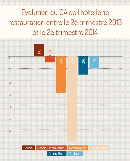 | Bien sûr, et comme souvent, tous les segments du CHR ne sont pas logés à la même enseigne. L’hôtellerie tire ainsi son épingle du jeu, avec un chiffre d’affaires en hausse de 1% pour les hôtels purs, et une quasi-stabilité pour les hôtels-restaurants (- 0,5%). Les restaurants et les brasseries quant à eux accusent plus sévèrement le coup. La baisse du chiffre d’affaires pour le deuxième trimestre 2014 s’établit respectivement à – 4% pour les restaurants et – 7% pour les brasseries. L’activité des cafés-bars décline elle aussi à – 1,5%, tandis que celle des traiteurs trébuche de – 1%. |