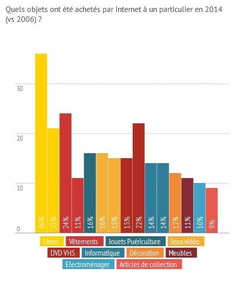 Du côté des vendeurs, logiquement, les biens les plus vendus sont les livres (31% en 2014 vs 8% en 2006), les vêtements (29% vs 10% en 2006), les meubles (19%), les jeux vidéos (15% vs 6% en 2006), les DVD / VHS (15% vs 7% en 2006), les jouets et puériculture (15%), l’informatique (13% vs 5% en 2006), la décoration (13%), l’électroménager (12%), et les voitures / motos / vélos (10%).