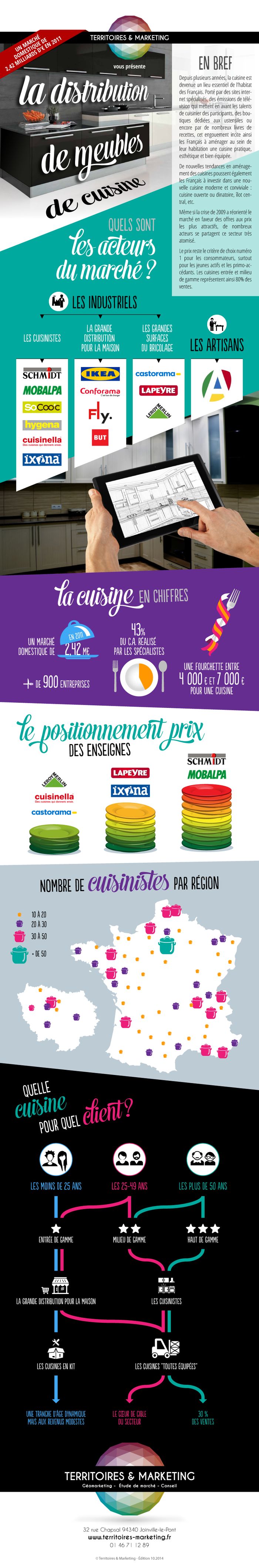 Cuisinistes de métier, grande distribution pour la maison, grandes surfaces de bricolage ou artisans, nombreuses sont les possibilités pour faire réaliser sa cuisine. Pièce centrale de la maison, valorisée par des sites internet spécialisés et des émissions de télé, la cuisine représentait, en 2011, un marché domestique de 2,42 milliards d’euros. Pour vous aider à y voir plus clair, Territoires et Marketing a réalisé une infographie permettant de faire le point sur le marché de la cuisine, les différents positionnements prix des enseignes, et les clients auxquels elles s’adressent.