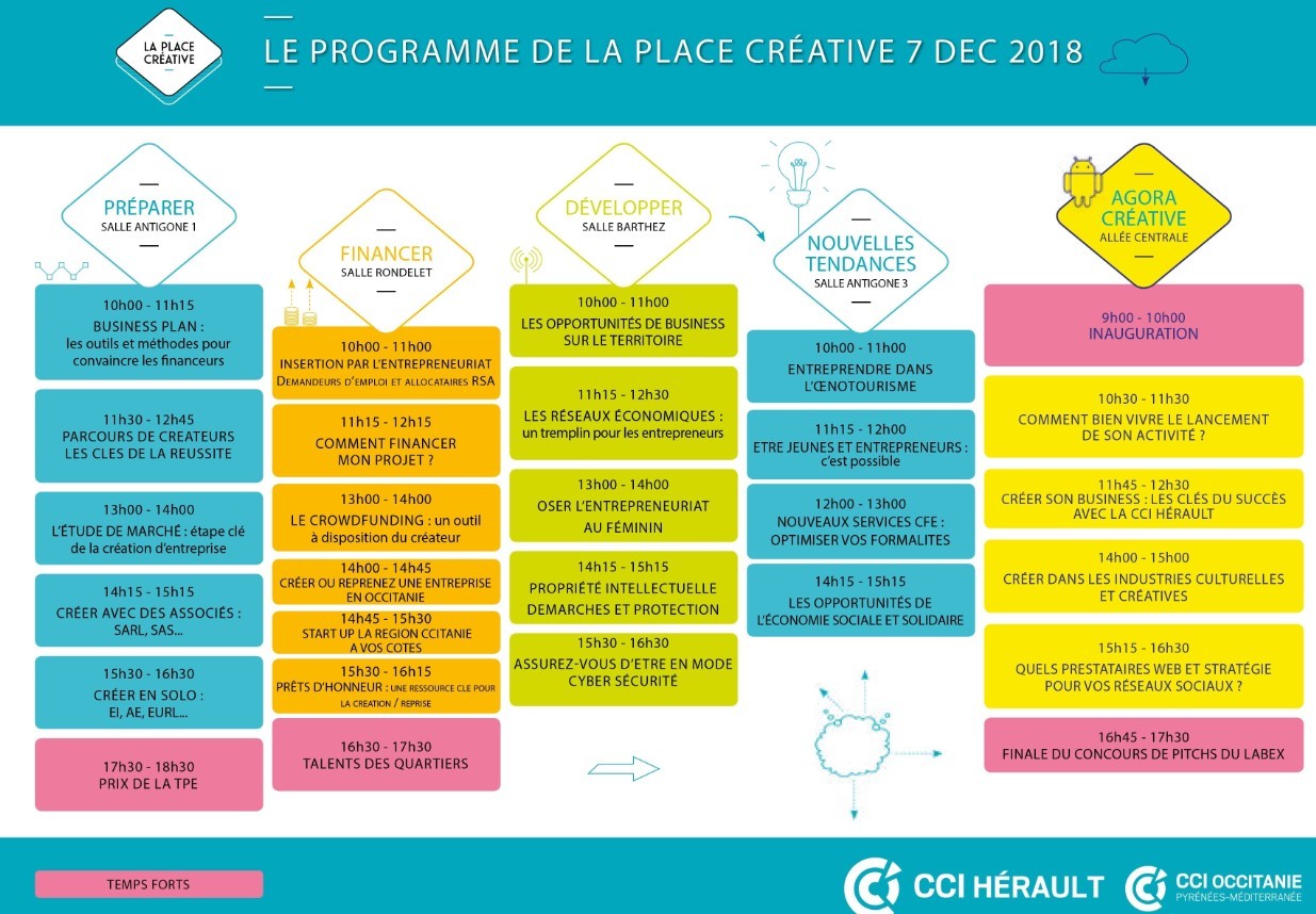 Organisé en partenariat avec la Chambre de Commerce et d’Industrie de Montpellier, et le Département de l’Hérault, la Place Créative 2018 est un événement régional dédié à la création d’entreprises. Ce forum d’échanges permet aux porteurs de projets, entrepreneurs, salariés ou mêmes les étudiants, de trouver des solutions et des conseils pratiques pour créer, développer, reprendre ou transmettre une entreprise. Prévu pour aujourd’hui (le 7 décembre 2018), La Place Créative est le rendez-vous annuel et incontournable des professionnels de la création ou de la reprise d’entreprise en Région Occitanie. Les chefs d’entreprise, consultants, organismes professionnels, experts et professions libérales se retrouvent ainsi de 9h à 18h au Corum, Esplanade Charles de Gaulle, à Montpellier, pour échanger avec tous les porteurs de projet désireux de se lancer dans le monde entrepreneurial, en leur apportant notamment des solutions pour réussir la réalisation de leur projet. Pour ce faire, des conférences thématiques sont planifiées tout au long de la journée permettant ainsi d’aborder collectivement des sujets essentiels comme le business plan, les aides aux créateurs ou encore les nouvelles tendances entrepreneuriales. Les porteurs de projets peuvent notamment bénéficier d’échanges personnalisés et individuels, en prenant rendez-vous gratuitement sur inscription avec les experts. L’occasion de peaufiner leur projet pendant 30 minutes avec des experts comptables, notaires, banquiers, avocats ou encore des spécialistes de la propriété intellectuelle.
