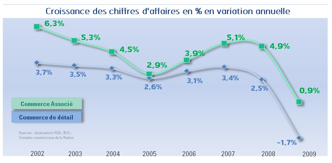 Malgré une année rythmée par la tourmente économique, les enseignes du Commerce Associé ont enregistré en 2009 une croissance de leur chiffre d’affaires de 0,9% située plus de deux points au-dessus de celle enregistrée par le commerce de détail sur cette même période (-1,5%). Ces performances ne sont que la continuité d’une tendance observée depuis des années, celle d’afficher au fil des ans une croissance supérieure à l’ensemble du commerce de détail français.