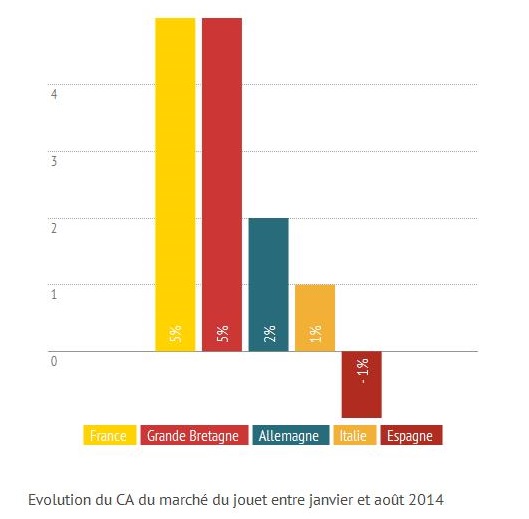 | Alors que Noël arrive à grands pas, le marché du jouet engrange en ce début d’année une progression de bon augure. En effet, selon les chiffres du cabinet NPD Group publiés dernièrement par la Fédération Française des Industries du jouet et de la puériculture, le marché du jouet a enregistré entre janvier et août une hausse de 5% de son chiffre d’affaires à 896,5 millions d’euros (contre + 3% sur la même période en 2013). Ce rebond place la France au 1er rang européen aux côtés de la Grande-Bretagne, et loin devant l’Allemagne (+ 2%), l’Italie (+ 1%) et l’Espagne (- 1%). |