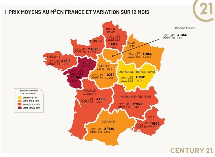La diversité des marchés se confirme à l’échelle des régions, avec une activité qui varie de -4,4% en Bourgogne-Franche-Comté à -19,6% dans les Pays de la Loire. Six régions enregistrent une baisse de 12,5% du volume de transactions. Les prix évoluent de -12,1% pour les Pays de la Loire à +4,4% pour PACA.