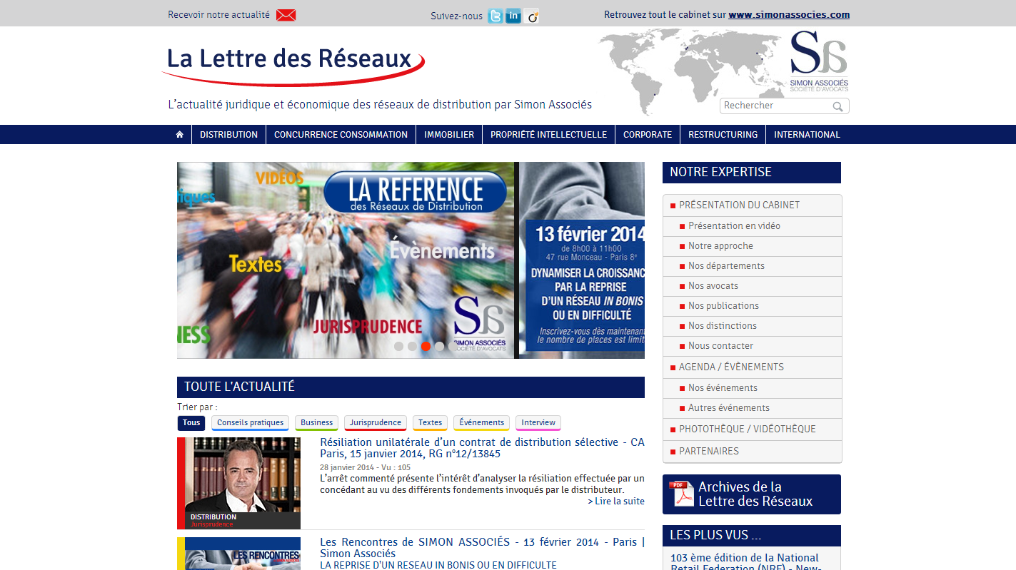 L’instigateur de la lettre des Réseaux, le cabinet SIMON ASSOCIES intervient en tant qu’expert sur le site, dans notre rubrique pôle des experts, qui rassemble les compétences de nombreux experts dans le domaine de la franchise. Cabinet de 50 avocats, SIMON ASSOCIES est reconnu par les principaux acteurs du monde de la distribution.