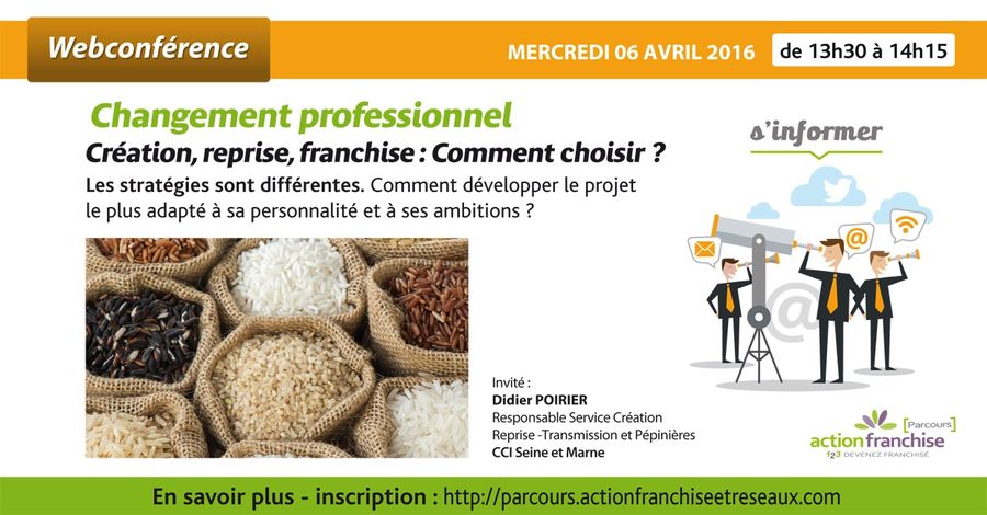 Changement professionnel : Création, reprise, franchise, comment choisir ? est le thème de la web conférence du mercredi 6 avril. Organisée de 13h30 à 14h15, cette conférence sera co animée par Corinne Gicquel, fondatrice du Parcours Action Franchise, et Didier Poirier, responsable service création-reprise-transmission et pépinières à la CCI de Seine et Marne.