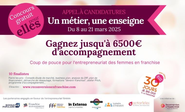 Cette année, les candidates tenteront de remporter plus de 6.500€ sous la forme de prestations d’accompagnement de la part de nos experts : conseils pour l’étude de marché, réalisation du business plan, formation pour devenir franchisé, pitch, financement,…