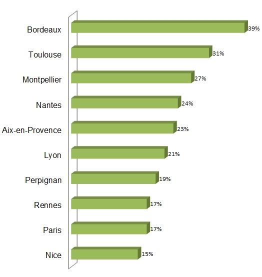 Sans conteste, le Top 10 des villes où il fait bon travailler ressemble à s’y méprendre à une liste de destination vacances. Ainsi, après Bordeaux en tête, l’étude l’Institut Great Place to Work® égraine un Top 10 très ensoleillé : Toulouse (31 % des citations), Montpellier (27 %), Nantes (24 %), Aix-en-Provence (23 %), Lyon (21 %), Perpignan (19 %), Paris (17 %) ex aequo avec Rennes, et sur la dernière marche du Top 10 Nice (15 %).