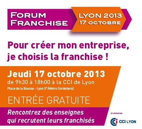 Créé en 2009, le Forum Franchise Lyon organise ce 17 octobre sa 5e édition. Cet événement voulu et organisé par la CCI de Lyon a gagné en importance d’année en année. L’accès visiteur est gratuit et la participation aux conférences nécessite une inscription préalable. La liste des enseignes présentes et des différentes conférences, le formulaire d’inscription et bien d’autres informations concernant cette journée sont disponibles sur le site du Forum Franchise Lyon.