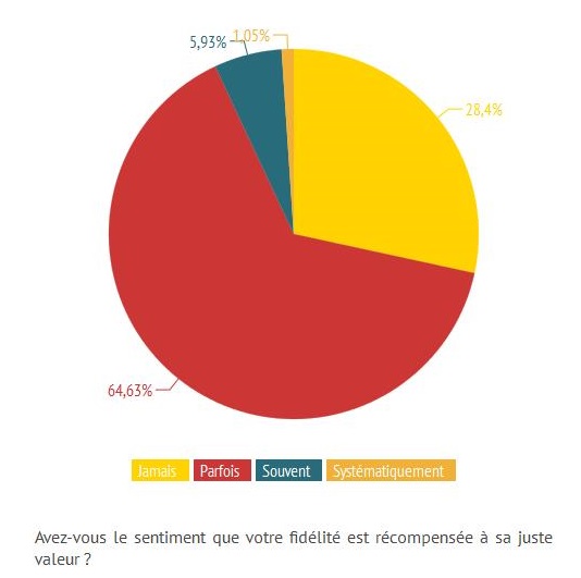 | Dans le détail, les chiffres sont éloquents. A la question « Avez-vous le sentiment que votre fidélité est récompensée à sa juste valeur ? », 28,4% des sondés répondent Jamais, 64,63%, Parfois, 5,93%, Souvent et seulement 1,05%, Systématiquement**.** De bien mauvais scores pour les marques ! D’autant plus mauvais que les Français ont le sentiment d’être plutôt fidèles. En effet, 54% des interrogés estiment que la fidélité passe par l’achat systématique de produits de la marque, et 58% recommandent leur marque préférée ! |