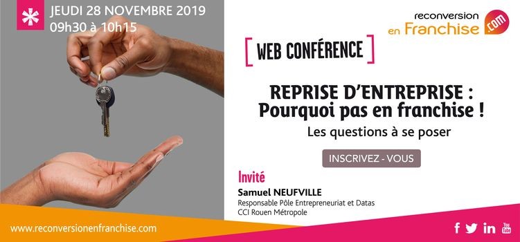 Pour obtenir les réponses à l’ensemble de ces questions et à toutes celles que vous pouvez vous poser avant de racheter une entreprise, n’hésitez pas à vous inscrire à la web conférence de Reconversion en Franchise, le 28 novembre, de 9h30 à 10h15.