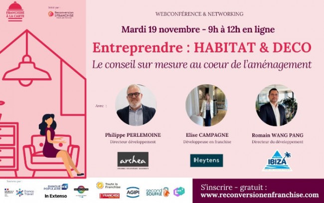 C’est pour discuter de ces opportunités, de ce marché et de leurs positionnements que les franchises Archea (spécialisée dans l’agencement intérieur), Heytens (spécialisée dans la décoration de la fenêtre) et Ibiza (spécialisée dans les piscines et l’aménagement extérieur) participent le 19 novembre prochain à la conférence interactive en ligne « Entreprendre : Habitat & Déco », organisée par la plateforme dédiée à l’entrepreneuriat au féminin reconversionenfranchise.com.