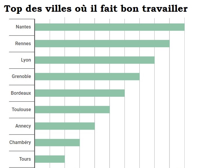 Le second classement, Où fait-il bon travailler, voit donc Nantes se hisser à la toute première place. La Cité des Ducs est suivie par Rennes, qui confirme donc son excellente santé et son attractivité, Lyon et Grenoble. Bordeaux, Toulouse et Annecy occupent respectivement les 5e, 6e et 7e marches du podium, juste avant Chambéry et Tours.