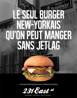 Avec des slogans tels que « Le seul burger new-yorkais qu’on peut manger sans jetlag », « Le seul burger new-yorkais qu’on peut commander sans parler un mot d’anglais » ou encore « Le seul burger new-yorkais qu’on peut payer en euros », l’enseigne française de burgers 231 East Street marque pleinement sa différence dans ce marché en plein développement. Car l’enseigne, créée en 2011 et développée en partenariat depuis 2012, revendique un concept totalement new-yorkais (cuisson de la viande au choix, recettes traditionnelles américaines, décoration typée), en décalage avec une concurrence qui mise au contraire sur des recettes exotiques, « franchouillardes » ou autres. Et ce, avec une touche française indéniable qui se retrouve dans la qualité des ingrédients (pain artisanal frais, crudités fraîches et sélectionnées et surtout viande fournie par la boucherie Metzger) et des choix éthiques et responsables. Par cette campagne, l’enseigne, qui compte déjà 26 restaurants dans toute la France, devrait non seulement séduire de nouveaux clients et ainsi générer du trafic dans les points de vente, mais aussi de nouveaux porteurs de projets ! Si vous aussi vous souhaitez rejoindre un réseau unique, atypique et dynamique, contactez l’enseigne pour ouvrir un restaurant 231 East Street !