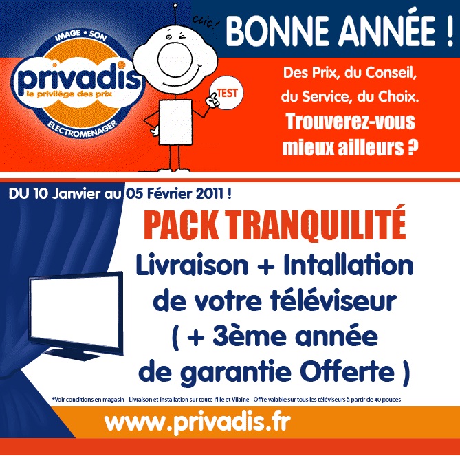 Si nos clients choisissent le Pack tranquilité (livraison + installation de votre téléviseur), ils bénéficient d’une troisième année de garantie offerte ! Offre valable du 10 Janvier au 05 Février 2011 dans tous les magasins Privadis !