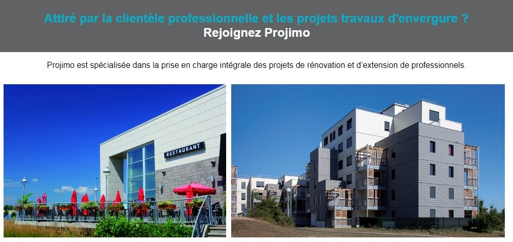 Fondé en 2010 par Camif Habitat, acteur majeur du secteur de la rénovation et de l’habitat intégré au groupe Maison France Comfort, l’enseigne Projimo est spécialisée dans la gestion de tous types de chantier d’extension ou de rénovation de locaux professionnels : hôtel, immeubles, bureaux, cliniques, commerces, etc. Certifié NF Habitat RGE, Projimo s’impose aux professionnels comme un partenaire de choix pour assurer la prise en charge complète de tous leurs projets de travaux avec un engagement contractuel sur le respect du budget et des délais. Les solutions Projimo intègrent en outre un accompagnement dans le montage des dossiers de demande d’aides financières et, bien sûr, une haute qualité de conseils, que ce soit dans le domaine technique comme conceptuel.