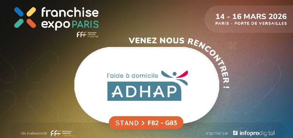 Du 14 au 16 mars 2026, ADHAP sera présent à Franchise Expo Paris, Hall 1, stand F82 - G83. L’enseigne y présentera son concept, ses zones de développement prioritaires et son dispositif d’accompagnement. L’objectif est d’échanger avec des porteurs de projet intéressés par la franchise de services à la personne.