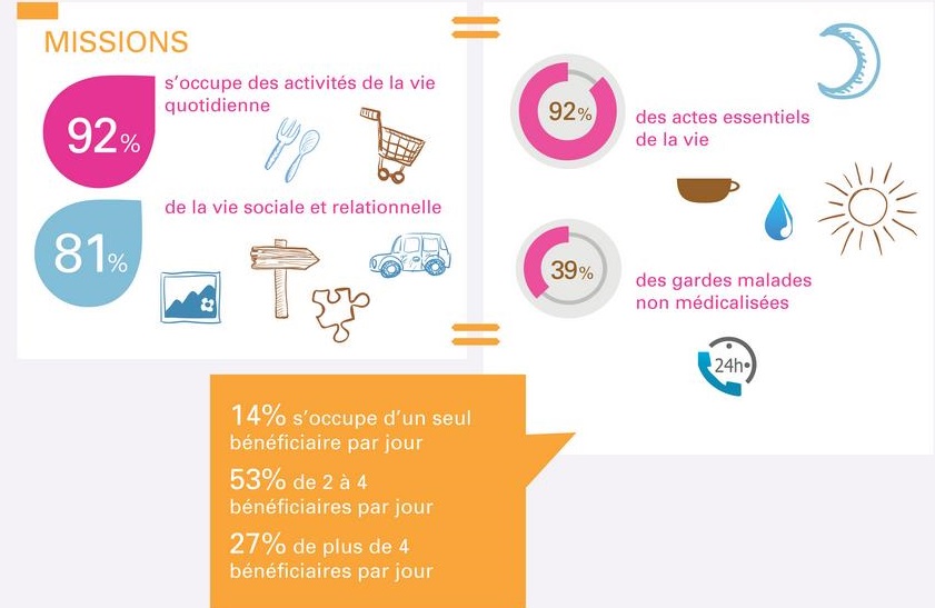 | Cette étude est également l’occasion d’apprendre que plus de la moitié des auxiliaires de vie s’occupent de deux à quatre bénéficiaires par jour. Seuls 14% ne gèrent qu’une seule personne et 27% rendent visite à plus de 4 bénéficiaires tous les jours. Une large majorité des missions (92%) est consacrée aux activités de la vie quotidienne, avec la préparation des repas ou les courses, par exemple. |