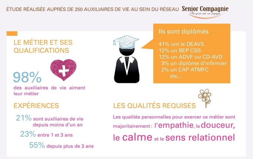 Qui sont les auxiliaires de vie ? Auprès de qui interviennent-ils ? Quelles sont leurs tâches ? Quelle est leur formation ? Autant de questions auxquelles s’est efforcé de répondre le réseau Senior Compagnie, à travers son Observatoire du métier d’auxiliaire de vie. Cette étude, réalisée auprès de 250 intervenants du groupe spécialisé dans l’aide au maintien à domicile, met en avant de nombreux chiffres, afin de mieux appréhender les réalités du métier.
