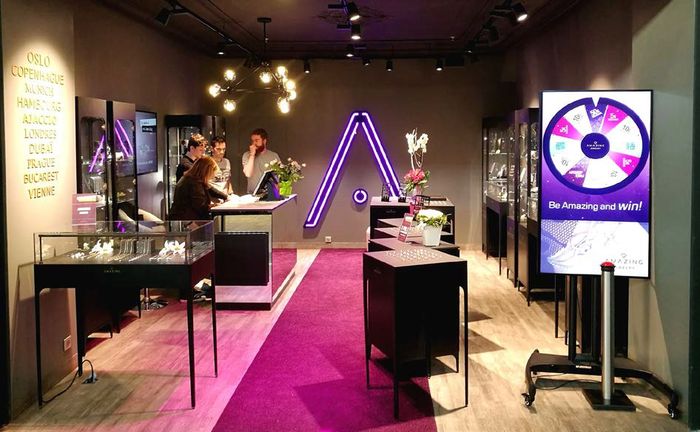 Et pour valoriser ses produits, Amazing déploie un réseau de boutiques à l’agencement qui casse les conventions de l’univers de la bijouterie. Dans une ambiance lounge, les bijouteries Amazing adoptent les normes de la bijouterie de luxe, avec une présentation des bijoux sous cloche en verre et un éclairage valorisant, tout en affichant une approche profondément jeune, avec des écrans, des chargeurs pour smartphones, un fond musical d’inspiration Deep House et des animations comme le « Selfie Station » ou la « Roue de la Fortune ». Amazing cible prioritairement une clientèle de 18-30 ans et le revendique.