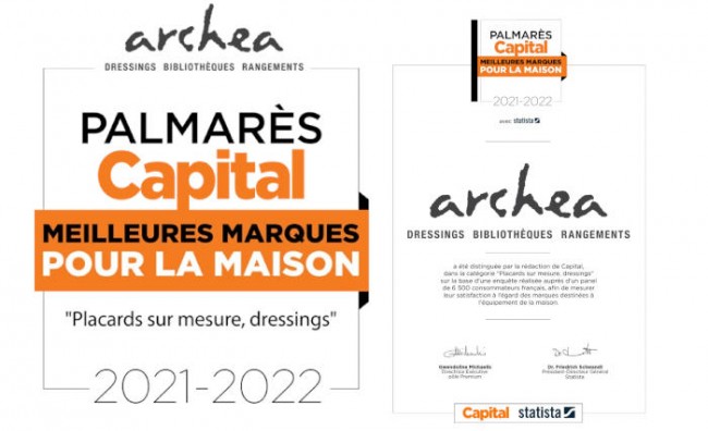 L’enseigne ARCHEA vient d’être désignée par les consommateurs 2e Meilleure marque pour la maison 2022, dans la catégorie placards sur-mesure et dressing, au Palmarès Capital.