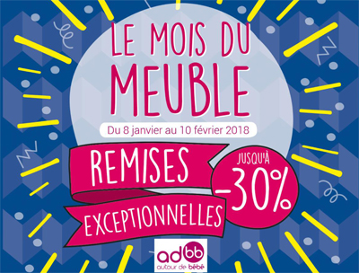 L’enseigne spécialisée dans les articles de puériculture et l’équipement pour bébés et parents lance du 8 janvier 2018 au 10 février 2018 une opération promotionnelle intitulée le « Mois du meuble ». Au menu : jusqu’à 30% de remises sur une sélection de produits.L’univers de bébé en promotions
