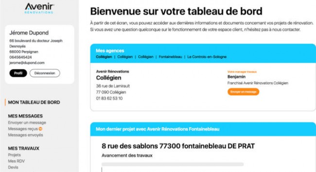 Coordonnées de l’agence, état d’avancement des travaux, liste des rendez-vous, devis, factures mais aussi messagerie dédiée, suivi des SAV, assistance et accès à la plateforme de parrainage pour cumuler des points : le nouvel espace client digital de la franchise Avenir Rénovations favorise la relation client et la satisfaction.