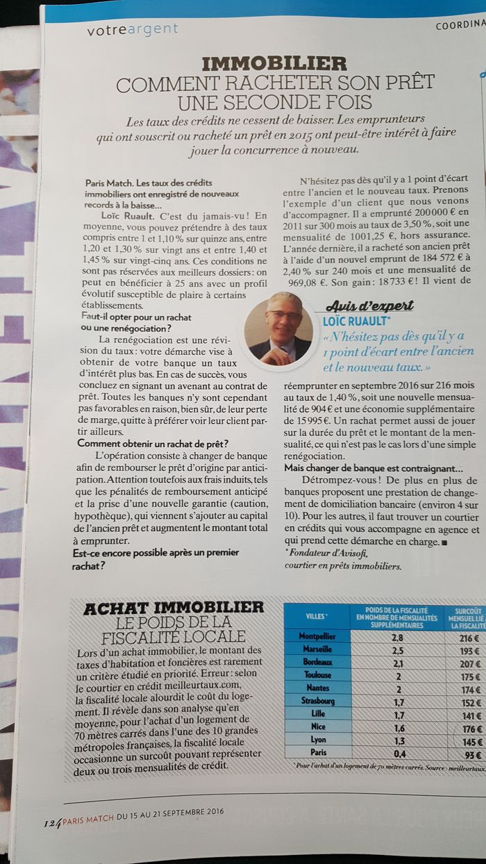 Dans sa rubrique “Votre Argent”, l’hebdomadaire a en effet interviewé Loïc Ruault, fondateur du réseau Avisofi, sur le thème “Comment racheter son prêt une seconde fois ?”, une question qui a toute son importance à l’heure où les taux des crédits sont passés sous la barre des 1,5%, voire sous les 1% !