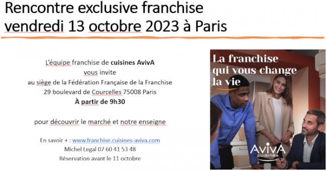 Vendredi 13 octobre à Paris, vendredi 10 novembre à Nancy et vendredi 8 décembre à Marquette-lez-Lille, l’enseigne AvivA Cuisines organise des réunions d’information afin de présenter son concept et ses atouts aux candidats à la franchise attirés par le secteur de la cuisine. A vos agendas.