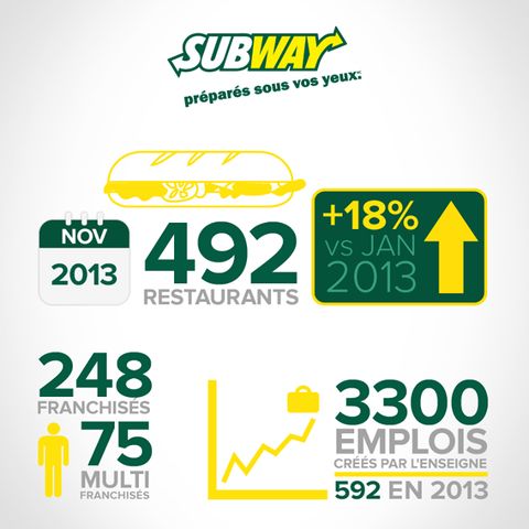 L’autre enseignement apporté par cette infographie c’est que ces quelque 492 restaurants Subway® sont gérés par près de 250 franchisés et 75 multi-franchisés. Ce chiffre met en avant la volonté du réseau Subway® d’encourager la multi-franchise dévoilant qu’un multi-franchisé Subway® gère en moyenne 3,3 restaurants. Il illustre les perspectives offertes par le concept Subway® aux entrepreneurs qui souhaitent faire évoluer leur affaire en ouvrant et gérant plusieurs restaurants. A l’image de Daniel Franco, franchisé Subwy® dans les Hauts-de-Seine qui a obtenu en octobre dernier le Grand Prix de la Multi-franchise dans le cadre du 26e Concours de l’IREF des « Meilleurs Franchisés et Partenaires de France » (cf. Un franchisé Subway® obtient le Grand Prix de la Multi Franchise).