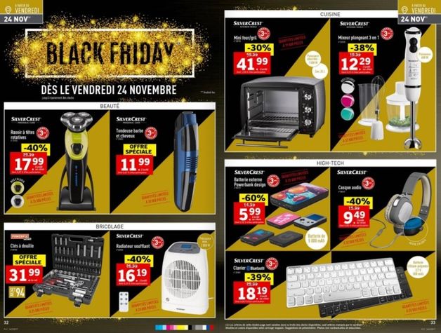 Si la tradition du Blcak Friday remonte aux années 60 aux Etats-Unis, cette opération commerciale, qui a lieu le vendredi qui suit Thanksgiving, n’est arrivée que relativement récemment en France. Mais désormais, les enseignes qui y ont pris goût rivalisent d’imagination pour offrir de supers promos à leurs clients. C’est notamment le cas de Lidl qui, cette année, a même édité deux pages spéciales Black Friday dans son catalogue publicitaire de la semaine.