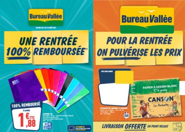Opération « 100% remboursé » : une offre immanquable ! Dès le 5 août 2024, Bureau Vallée lance son célèbre « 100% remboursé » qui se poursuivra jusqu’au 10 août. Cette opération permet aux clients de se faire rembourser jusqu’à 21,35 € TTC sur une sélection de 16 produits essentiels pour la rentrée : cahiers, classeurs, stylos, et bien plus encore. L’année dernière, cette initiative a été un franc succès avec près de 68 000 familles remboursées. Bureau Vallée ambitionne de réitérer cet exploit en 2024. « On pulvérise les prix » : des réductions massives ! Mais ce n’est pas tout ! Pour répondre à l’inflation et aider les familles à maîtriser leur budget, Bureau Vallée lance une nouvelle opération du 19 août au 7 septembre : « On pulvérise les prix ». Plus de 150 produits verront leurs tarifs réduits jusqu’à -60%, offrant ainsi aux clients l’opportunité de faire le plein de fournitures et de matériel de bureau à des prix défiant toute concurrence. Adrien Peyroles, Directeur Général de Bureau Vallée, explique cette stratégie : > Le mois d’août est une période cruciale pour les familles. Nous souhaitons leur offrir des solutions adaptées pour qu’elles puissent préparer la rentrée en toute sérénité. C’est pourquoi nous proposons des opérations commerciales très attractives, combinées à des prix bas toute l’année.