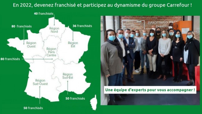 La franchise est un axe fort de la stratégie du groupe Carrefour. Chaque année, ce sont plus de 350 nouveaux partenaires qui rejoignent l’une de nos enseignes et qui participent au dynamisme et à la croissance du groupe. Carrefour a la volonté que ses franchisés s’épanouissent et performent. C’est pourquoi, ils bénéficient d’un accompagnement complet avec un programme de 2 à 6 mois qui allie formations théoriques (législation, hygiène, produits, management, commerce…) et formations pratiques. Quelles que soient leurs expériences professionnelles précédentes, ils vont être formés, aller sur le terrain et être accompagnés par un tuteur qui va leur transmettre son savoir-faire et les ficelles du métier.