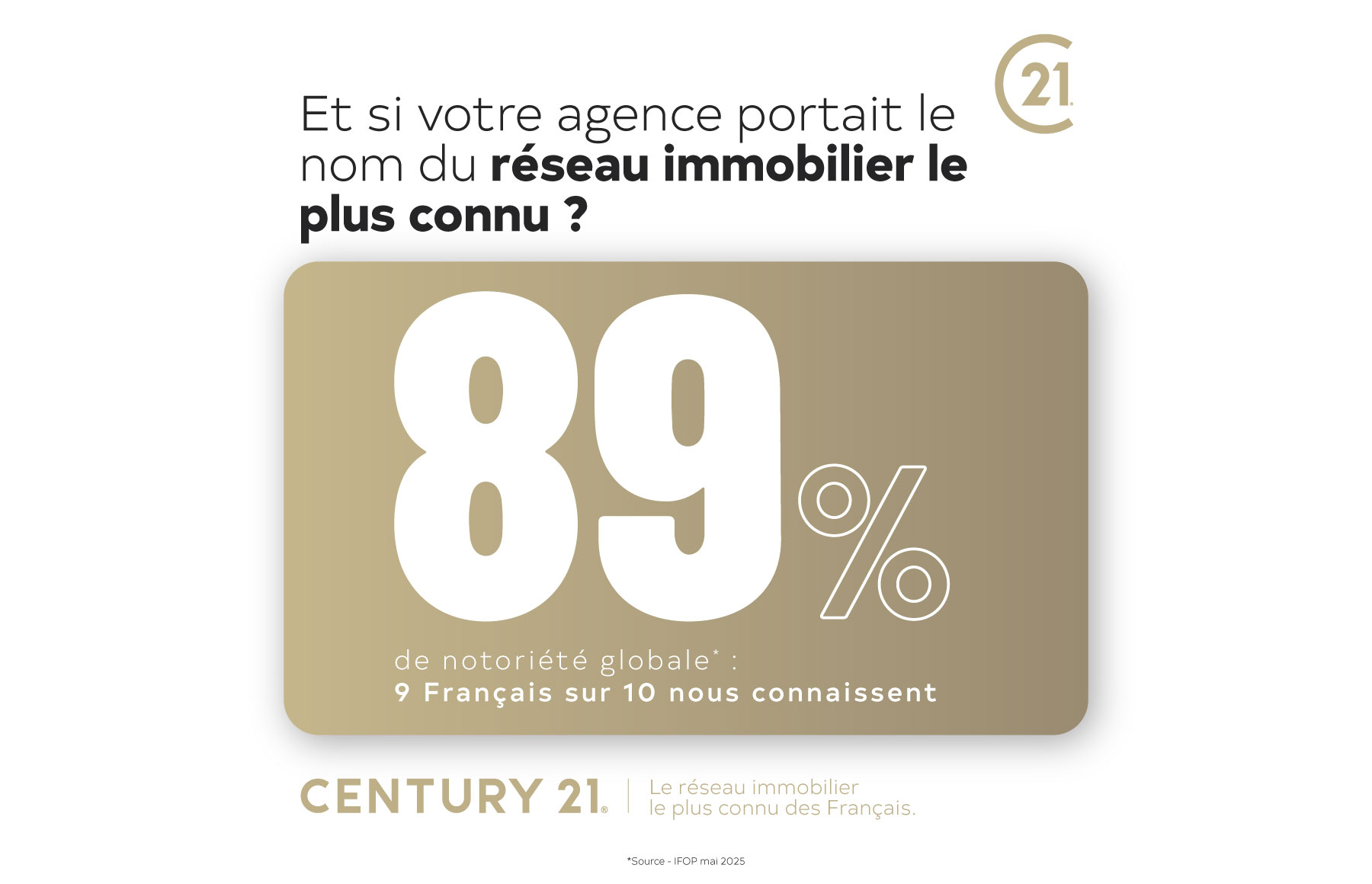 Une enquête IFOP de mai 2025 positionne CENTURY 21 comme le réseau immobilier à la notoriété la plus forte auprès des professionnels, avec 89% de notoriété selon le Baromètre d’image auprès des gérants d’agences immobilières.