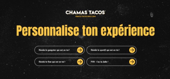 Chamas Tacos propose une nouvelle expérience digitale Sous le thème de “Personnalisez votre expérience, tout comme vous personnalisez votre tacos”, Chamas Tacos propose une nouvelle expérience sur son site internet. Cette plateforme offre aux internautes, amateurs de jeux vidéo, passionnés de sport, admirateurs de la marque ou mélomanes, l’opportunité de découvrir Chamas Tacos à travers leur passion. Ce nouveau site internet vous fera découvrir les produits de la marque en fonction de votre personnalité ; une façon originale de présenter leur menu et de se démarquer de la concurrence. >> Lire aussi : Chamas Tacos ouvre ses portes à Besançon