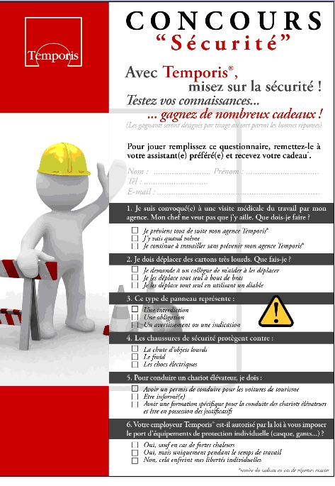 Pour sensibiliser les clients intérimaires aux accidents de travail, Temporis® a mis en place un concours Sécurité (sous forme de jeu sur le thème de la sécurité, avec un cadeau à la clé !). En effet, du 1er Août au 28 septembre, il suffit de cocher les 6 bonnes réponses sur le questionnaire disponible dans chaque agence Temporis® pour participer à un tirage au sort. Tout le monde est gagnant : - Le client intérimaire : tout questionnaire rempli correctement donne droit à un premier cadeau et permet de participer au tirage au sort. Même les mauvaises réponses sont, quelque part, gagnantes : elles permettent à leurs auteurs de se remettre les règles de sécurité en tête et ainsi d’améliorer leur sécurité dans les prochaines missions. - Le client entreprise : les intérimaires délégués par Temporis® seront formés à la sécurité. Un tirage au sort par agence Temporis® sera effectué à la fin du concours. Parce que chaque client intérimaire est particulier, chaque agence Temporis® est libre de choisir le cadeau qu’elle offrira au gagnant. Une participation nombreuse est attendue, la demande en matière d’intérim étant particulièrement élevée. De plus le questionnaire ne comprend que 6 questions : il est donc rapidement rempli. Cela crée une nouvelle occasion aux clients intérimaires de se rendre dans leurs agences Temporis® pour discuter sécurité au travail. A propos du réseau Temporis® (www.temporis-franchise.fr) La franchise Temporis®** est née de la volonté de répondre « idéalement » aux attentes de l’ensemble des Hommes qui sont les acteurs du travail temporaire en alliant souplesse d’un indépendant et réactivité d’un grand groupe. Après l’ouverture de l’agence pilote à Brive la Gaillarde (Corrèze) en 2000, le réseau fêtera l’ouverture de la 50ème agence cette année. Compte tenu de la forte demande de franchises, l’objectif fixé est celui de 100 unités en 2010 Pour plus d’informations : Elise FORGUE valorisdev@wanadoo.fr Tél : 05.62.79.86.00