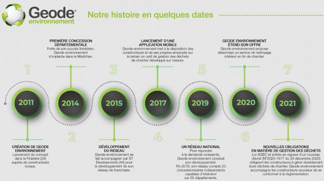 Né dans le Finistère en 2011, Geode environnement s’est ouvert aux entrepreneurs indépendants en 2014 pour déployer un réseau qui compte aujourd’hui 22 concessionnaires couvrant une soixantaine de départements. Au cours de l’année 2021, Geode environnement devrait intervenir sur 10.000 chantiers au niveau national pour collecter, trier et évacuer les déchets nuisibles à l’environnement vers des structures de valorisation agréées.