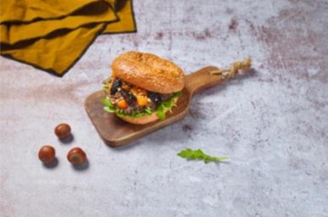 - Un bagel chaud, canard et courge agrémenté de roquette, de pruneaux et de noisettes torréfiées ;